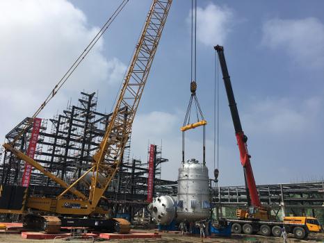 图为在中沙(天津)石化聚碳项目施工现场,首吊最昂贵“明星设备”DMC反应器正在吊装。