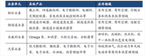 制冷空调电器零部件业务主要产品包括四通换向阀、电子膨胀阀、电磁阀、微通道换热器、Omega泵等,广泛应用于空调、冰箱、冷链物流、洗碗机等领域;汽车零部件业务主要产品包括热力膨胀阀、储液器、电子膨胀阀、电子水泵等,广泛应用在传统燃油车、新能源汽车的热管理领域。”