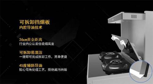 G16集成灶采用可拆卸挡烟板、内腔导油技术,26cm黄金距离:行业内公认最佳吸烟高度。