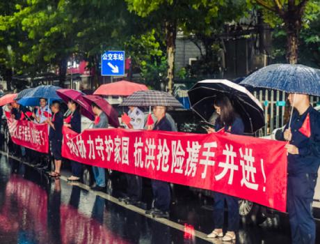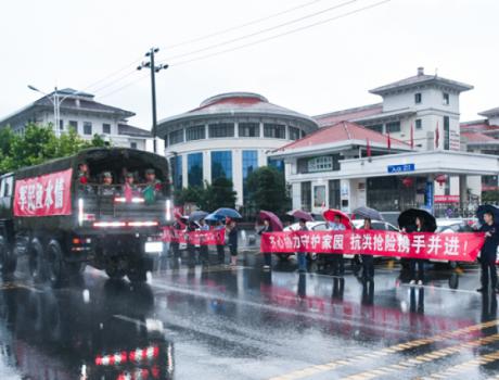 7月27日凌晨,湖口县电闪雷鸣,天空中下起了暴雨。得知驰援湖口抗洪部队今早将离开湖口,当天早上不到5点,30多名方大九钢员工冒雨前来送行,表达深深感激之情,尽显军民鱼水情。
