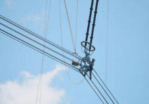 作业现场,3名带电作业人员穿着特制的高压屏蔽服,乘坐吊篮上升到90米高的作业点下方,与塔上3名作业人员、1名专责监护人员配合更换合成绝缘子,完成带电作业后返回地面,整个过程持续近6小时。