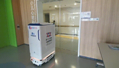 5G机器人在院内自动避障穿行呼,叫并搭乘电梯,不仅如此,它还会呼叫并搭乘电梯。