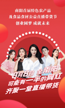 为了助力我市受疫情影响销量的南阳地域特色优质农产品、食品食材产品拓展销路,扶农助农促进就业创业,推动本地食品食材电商行业的发展。在南阳市商务局、南阳市人社局、南阳市工商联指导下“南阳首届特色农产品及食品食材公益直播带货节”将于8月8日-9日举办。