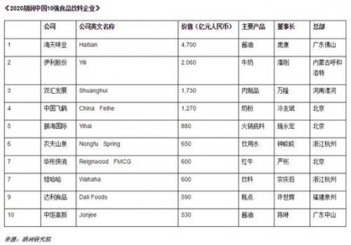 2020胡润中国10强食品饮料企业-农夫山泉首次进入榜单