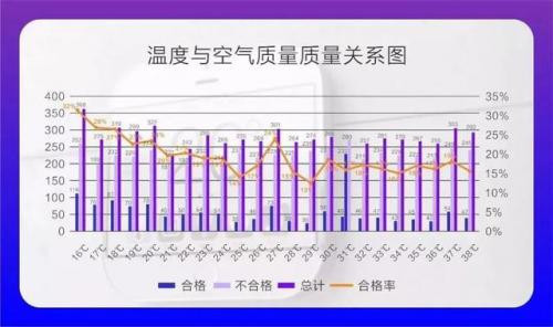 调查显示,室内空气质量与环境温度相关,从合格率跟环境温度的趋势图可以看出,合格率跟温度升高呈现负相关性趋势,也就是说,温度越高,室内空气质量越差!
