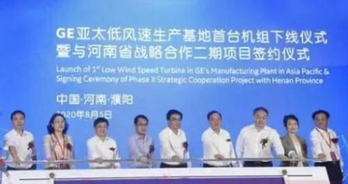 8月5日,美国通用电气(GE)在濮阳建设的亚太低风速风电设备生产基地首台机组下线,标志着河南省与通用电气开展战略合作迈出坚实步伐。