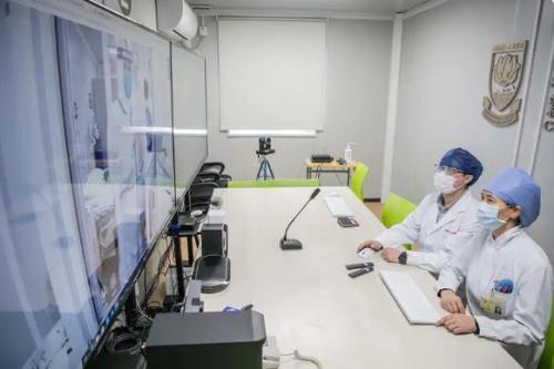 ▲ 在市一医院新建成的5G标准发热门诊及隔离病房里,医生正通过5G智能机器人进行远程查房