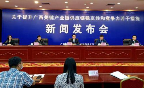 “提升产业链供应链稳定性和竞争力,是习近平总书记和党中央着眼国际国内新形势作出的重大决策部署。”刘胜友介绍,为落实党中央的决策部署,广西壮族自治区党委、政府在全国较早地部署提升关键产业链供应链稳定性和竞争力工作。7月2日,自治区印发《关于提升广西关键产业链供应链稳定性和竞争力若干措施的通知》(下称《若干措施》)。《若干措施》总共35条政策措施,主要内容可以概括为“一场攻坚会战、一个专项行动、两大循环体系,一条攻关路线、一套支持政策、一个工作机制”。