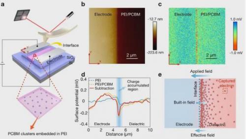 a:聚合物-分子半导体复合体系能级与电荷转移示意图. b:分子半导体静电势分布. c:电极/聚合物界面表面电势分布.