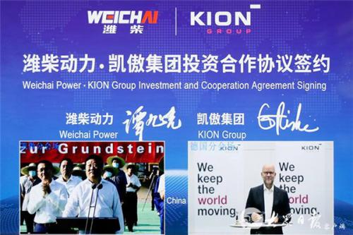 活动的当天,谭旭光与凯傲集团首席执行官高登·李斯克在线签署潍柴动力与德国凯傲投资合作协议。谭旭光在现场表示:“这是一个历史性的时刻,充分体现出凯傲集团与潍柴动力之间牢固紧密、互信互赖的合作伙伴关系。自2012年以来,我们在携手走过的数年中取得了丰硕的成果。智能叉车项目将是这条增长道路上的又一里程碑。”