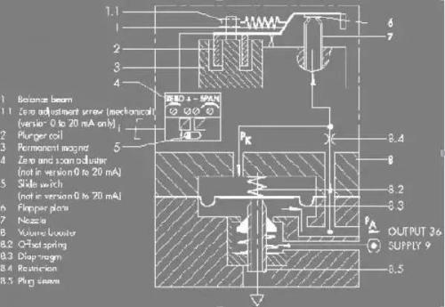 气动功率放大器(8)在设计时;选用合适的弹簧力(8.2),使当输入信号为0mA时保持输出PA在100mbar,这样输出的压力通过恒节流孔(8.4)使喷嘴(7)内有一定的背压。