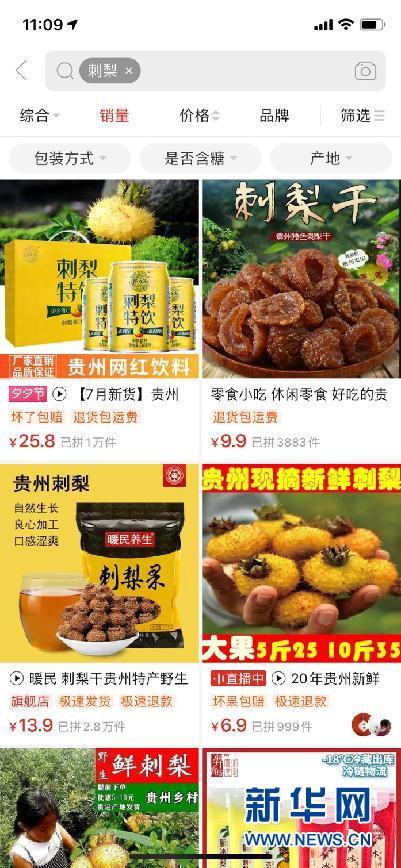 8月19日,拼多多平台热销的贵州刺梨加工产品。新华网发