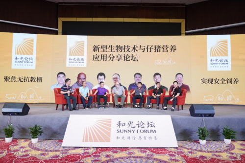会议最后,主办方特设沙龙讨论环节,上海源耀农业股份有限公司特邀专家吴昌征博士客串论坛主持人,中国农业大学动物科学技术学院副院长王军军教授、巨星农牧股份有限公司猪营养总监刘宏伟博士、北京恩睿康农业技术咨询有限公司朱稳森博士、征泰集团副总裁、技术总监金伟博士、扬州立鼎系统工程有限公司总经理吴兵、微生物发酵专家、微生物工程师香红星作为论坛嘉宾以“新型生物技术与仔猪营养应用”为主题展开深入讨论,主要讨论了“生物饲料在当前行业背景下的意义及应用,在应用过程中易出现的主要问题及解决方法”、“无抗环境下,仔猪所面临的问题及解决方法”、“生物发酵全价饲料的可行性、发酵设备制造的未来趋势以及核心”、“肠道微生物组与仔猪健康的相关研究”等问题,在现场答疑环节,台上台下也有热情的互动。