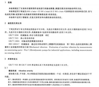 本标准适用于转速为600r/min—12000r/min(小于600r/min可参照使用)的各种型式泵,泵与电动机共轴(或泵轴与电机轴采用刚性联轴器连接)的泵机组。