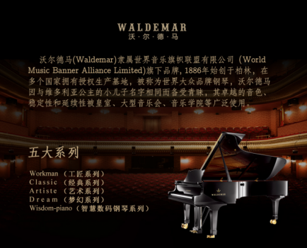 沃尔德马(Waldemar)隶属世界音乐旗帜联盟有限公司(World Music Banner Alliance Limited)旗下品牌,?1886年始创于柏林,在多个国家拥有授权生产基地,被称为世界大众品牌钢琴,沃尔德马因与维多利亚公主的小儿子名字相同而备受青睐,其卓越的音色、稳定性和延续性被皇室、大型音乐会、音乐学院等广泛使用。