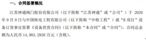9月14日消息,江苏神通(证券代码:002438)发布公告称,公司于2020年9月9日与中国核电工程有限公司就“R项目”设备订货事宜签署《设备供货合同》,合同总金额为人民币14,983.2938万元(含税)。