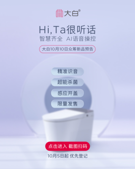 diiib大白卫浴AI声控智能马桶,即将在10月10日于小米有品上线!特推出2600套限量版众筹。