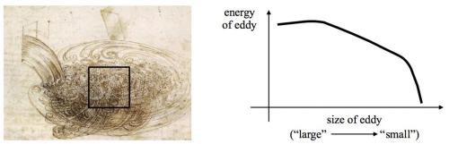 正如达芬奇的素描中所描绘的那样,一股股流冲入水池最初会形成一个大的漩涡状涡流,该涡流很快变得不稳定并分解为逐渐变小的涡流。能量从较大的涡流转移到越来越小的涡流,直到最小的涡流通过水的粘度消散能量。