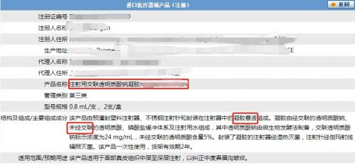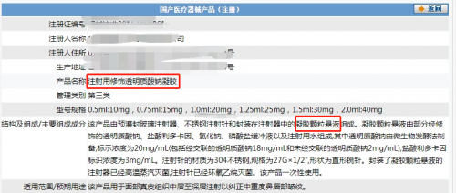 在国家食药监局的备案中,通过该产品的结构及组成成分,可轻松辨别凝胶型和颗粒型玻尿酸。在结构及主要组成成分中,含有“凝胶悬液”或“凝胶”的就是凝胶型玻尿酸,含有“凝胶颗粒悬液”的就是颗粒型玻尿酸。对此,国家食药监局官网上有公开的数据,如下图: