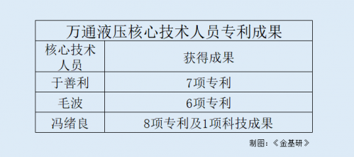 观其核心技术人员情况,截至2020年3月31日,万通液压共有3名核心技术人员,分别为于善利、毛波、冯绪良,三人分别取得了7项、6项、8项专利,此外,冯绪良还取得1项科技成果。
