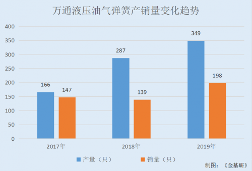 2017-2019年,万通液压油气弹簧产量分别为166只、287只、349只;同期,万通液压油气弹簧销量分别为147只、139只、198只。