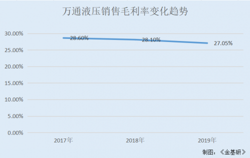 2017-2019年,万通液压的销售毛利率分别为28.6%、28.1%、27.05%,近年来毛利率稳定。