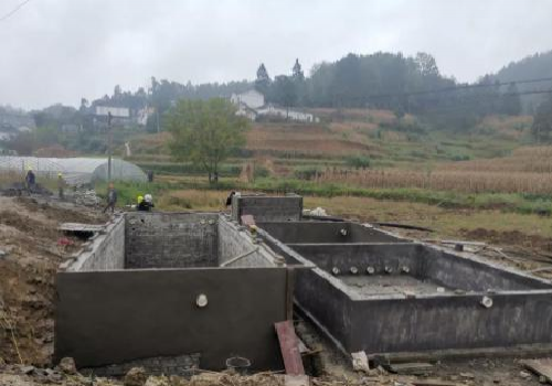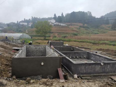 在桂花乡回龙社区农村生活污水治理项目施工现场,工人们正在建设污水处理终端。