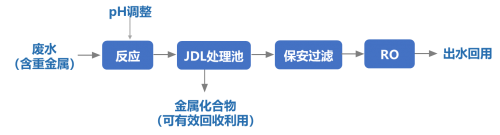 JDL工艺集固液分离、固体悬浮物浓缩、废水处理回用、重金属资源回收于一体,实现了“废水处理回用+重金属资源回收”的重金属废水处理模式;出水水质达到相关行业重金属废水排放标准,回收重金属可作为相关产品直接利用,显著减少了剩余危废物,实现了废水中有价金属的资源化,一定程度上缓解了重金属危废处理难题;处理过程中不加入聚丙烯酰胺(PAM)、铁盐、铝盐等絮凝剂,使膜组件不易堵塞。