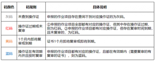 所谓特种作业人员安全码,就是省应急管理厅推出的针对特种作业人员风险管控的应用程序,分为“红黄蓝灰”四色,其中黄码和蓝码为允许上岗作业,红码、灰码则是禁止作业。一个“安全码”集数字身份认证、电子证照信息、特种作业记录于一体,通过领码上岗、亮码作业、码上学、码上管、码上查、变码监测六大手段,实现持证人员、用人单位、监管部门信息的高效实时互通,从而对特种作业人员、作业活动实施精准管控。