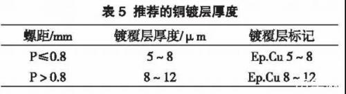 铜的熔点为1083℃左右,在高温环境下,可以避免螺纹件烧结,给维修和拆卸造成不便。对于发动机排气部位的紧固件,使用镀铜主要就是为了解决高温烧结的问题。此外,发动机耐热螺栓的表面处理方式还可以选择Magni504或二硫化钼。关于铜镀层的厚度,可以参考表5(数据源自QJ450B-2005)。