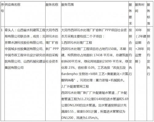 根据政府采购招标结果,山西省水利建筑工程局有限公司联合体(成员:北京碧水源科技股份有限公司、中国城乡控股集团有限公司、中国市政工程华北设计研究总院有限公司、山西机械化建设集团有限公司)为本项目综合排名第一的社会资本方。