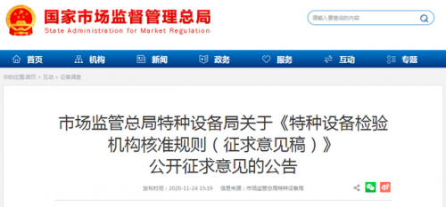 昨日,市场监管总局官网发布公告,为进一步规范特种设备检验机构的核准工作,推动特种设备检验工作改革和特种设备行政许可改革,市场监管总局组织起草了《特种设备检验机构核准规则(征求意见稿)》(见附件),现向社会公开征求意见,意见反馈截止时间为2020年12月15日。