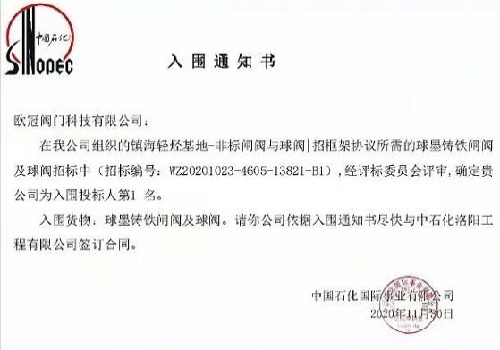 欧冠阀门科技有限公司摘得中国石化国际事业有限公司闸/球阀框架标第一名!