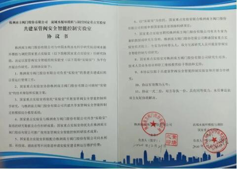 2020年12月,株洲南方阀门股份有限公司与中国水利水电科学研究院流域水循环模拟与调控国家重点实验室正式签署共建泵管阀安全智能控制实验室协议书。国家重点实验室将依托泵管阀安全智能控制实验室开展泵管阀安全智能控制科学研究,与南方阀门共建共享泵管阀安全智能控制过程模拟综合模型系统。