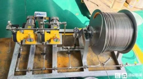 阻垢剂输送泵可在高温及酸性溶液内长期工作,主要用于传输井下液体,为控制长距离的液体流速及流量提供精确保障,实现对试验剂量的精确控制。此设备采用抗腐蚀性的316L型不锈钢材料,配有膜片动力泵2台、液体搅拌罐、φ6㎜316L管道500米,可以实现单项及双项的动力传输。