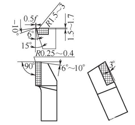 对刀杆材料的要求:加工不锈钢时,由于切削力过大,刀杆需有足够的强度和刚性,以免在切削过程中发生振颤,采用调质处理过的45钢即可。三角形螺纹车刀和切槽刀都选用粉末冶金材料,含钴高速钢或含铝超硬高速钢,用于低速车削。排屑槽半径最好选择4~6mm,宽度2mm,这样排屑更顺畅,阻力更小。螺纹刀要使用螺纹样板,一边刃磨,一边检验,达到60°角。