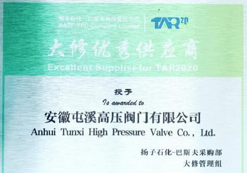 扬子石化-巴斯夫有限公司是中国石化扬子石化与德国巴斯夫合资成立的一家国际大型石化企业。2020年12月23日,在其成立二十周年之际,在南京召开了2020年全厂大检修优秀供应商评选表彰大会,从1000多家供应商中遴选出10家优秀供应商。安徽省屯溪高压阀门有限公司凭借与其多年的业务合作和持续提供优异的产品解决方案,成为这10家优秀供应商的其中之一,被授予 “大修优秀供应商”奖,获此殊荣的阀门企业仅此一家。公司总经理吴尖斌受邀参加此次表彰大会。