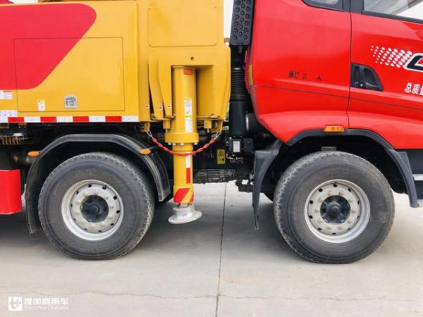 这款车型采用了加重型10片簧钢板悬挂,更主要目的是为这类高质量的上装提供稳定性,并且底盘局部也采用了与自卸车相类似的局部4层加厚骨架,并结合V型推力杆提升车辆在复杂路况下的通行能力。