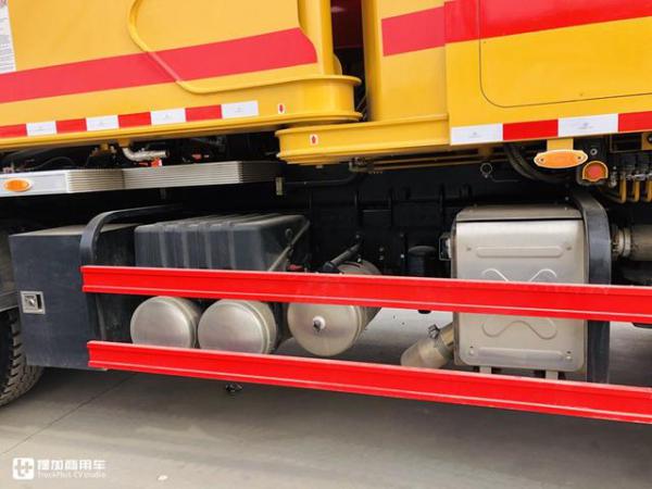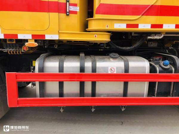 底盘侧面设有容量600L的铝合金油箱,容量40L的尿素罐,其外侧的支架采用了加强型的硬质金属材质。