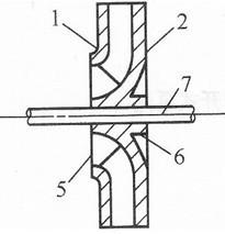 1一前盖板;2一后盖板;3一叶片;4叶槽;??? 1一吸人口;2一轮盖;3一叶片5一吸水口;6一轮毂;7一泵轴??? 4一轮毂;5一轴孔