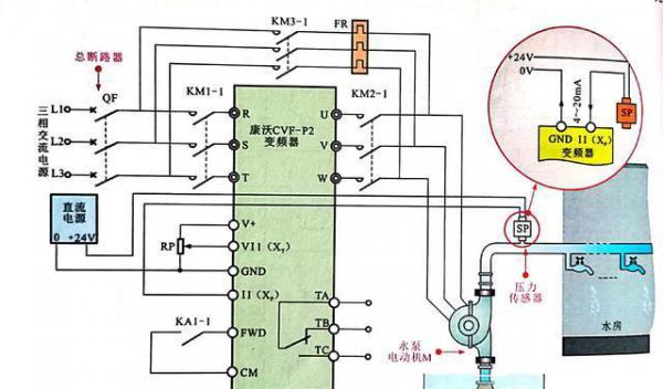 下图所示为一个单潜水泵恒压供水变频控制电路。