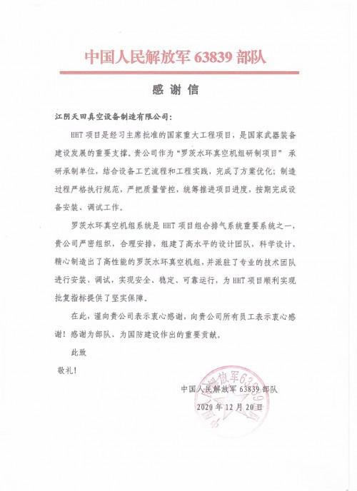 近日,江阴天田真空设备制造有限公司(以下简称天田真空)承研制的“罗茨水环真空机组项目”助力中国国防建设,该产品安全、稳定、可靠运行,为HHT项目的顺利实现批复指标提供了坚实保障,得到用户认可和感谢。