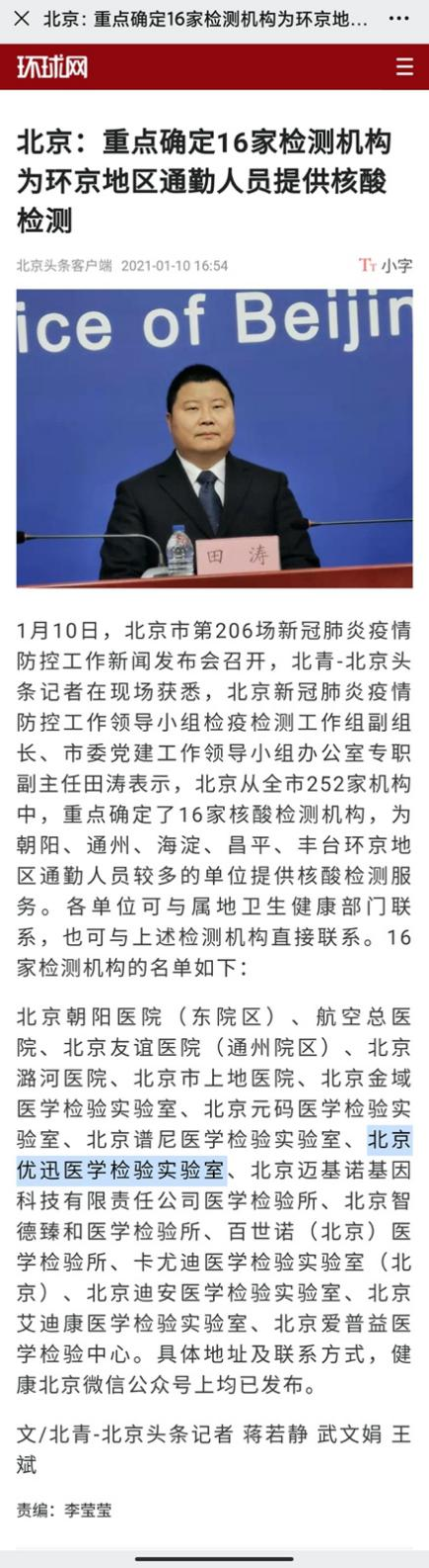 为了严防环京地区疫情传播风险,妥善做好环京地区在京通勤人员新冠病毒核酸检测工作,2021年1月,北京市从全市252家机构中,重点确定了16家核酸检测机构,为朝阳、通州、海淀、昌平、丰台环京地区通勤人员较多的单位提供核酸检测服务,北京优迅医学检验实验室有限公司(以下简称“优迅医学”),位列此次公布的名单之中。