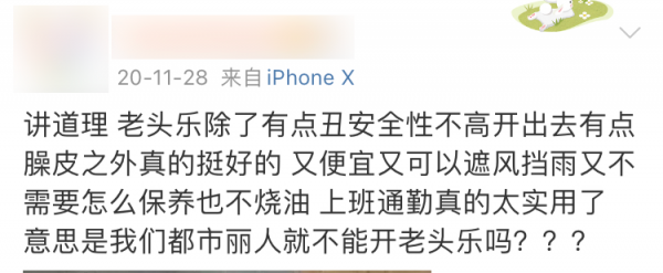 当一般的打工人还在共享单车上瑟瑟发抖,真正聪明的打工人都坐在了自带暖风的老头乐里。老头乐,都市丽人的新标配。/微博网友