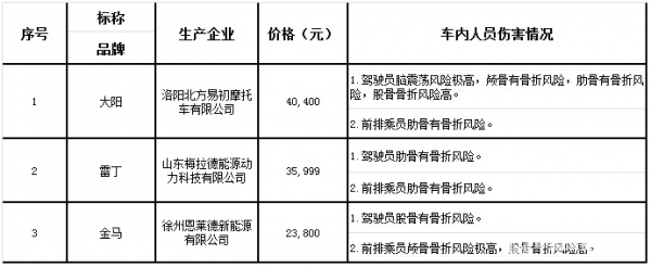 就老年代步车存在的安全隐患,中国消费者协会曾做过一次碰撞试验。试验模拟了在32km/h的碰撞速度下,代步车与前方壁障正面撞击的情况,所试的三款代步车内,假人驾驶员都受到了颅骨、肋骨、股骨等不同部位骨折的伤害。而这一测试速度,往往还低于现实中老年代步车真正的时速。