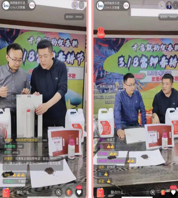 由陕西富钾副总经理许宜城先生、市场部总监席庚先生、陕西施耐乐技术总监张瑞龙先生担任主播,直播间福利不断,氛围火热,进口叶面肥,采用NDHA鳌合技术促进吸收,精彩不断!