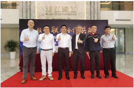 台达与浙江海工机械有限公司达成战略合作协议,台达-中达电通机电事业部总经理陈敏仁(左四)、海工机械总经理上官兆村(左三)、台达-中达电通机电事业部沪杭大区总监张绍坤(左一)等出席签约仪式