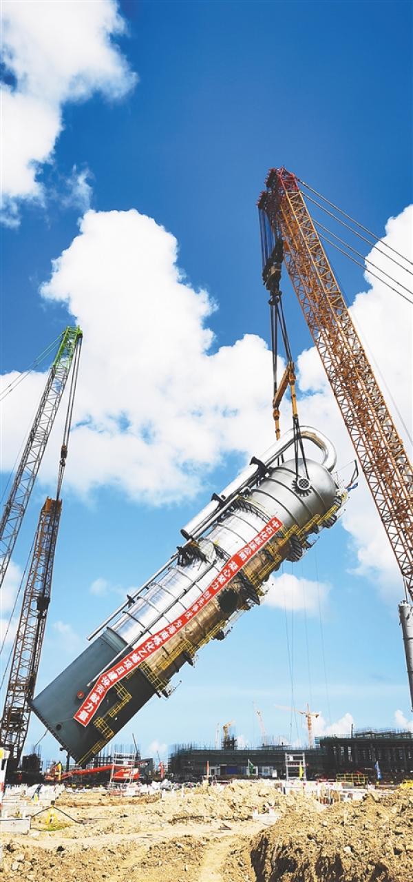 海南炼化百万吨乙烯项目现场首台大型塔器——重达1141.1吨的乙烯装置急冷水塔9日在海南洋浦经济开发区吊装就位,实现“塔起灯亮”,标志着项目大型塔器正式进入安装环节。