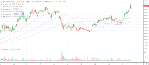 BITO是SEC于10月19日批准通过的首只比特币ETF,它所代表的合规比特币 ETF历时了8年才走入美国这个全球最为活跃的金融市场。上线首日,BITO的交易量已超过2390万股,按收盘价41.89美元计算,成交额超过10亿美元,创下历史次高记录。与此同时,BTC价格一路飙升,就在上市后第二天,比特币价格便已经超过了65000美元,突破4月创下的历史最高点。