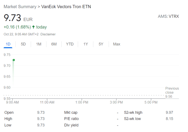 目前,TRX ETN已于9月21日、9月24日先后在德国的德意志证券交易所以及巴黎和阿姆斯特丹的泛欧交易所震撼上市并展开交易。这不仅TRX首次在主流传统证券交易所挂牌交易,也是继比特币和以太坊之后, VanEck重磅推出的第三只主流加密资产ETN。